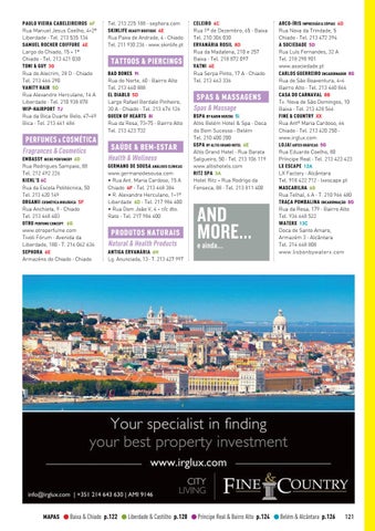PAULO VIEIRA CABELEIREIROS 6F Rua Manuel Jesus Coelho, 4-2º Liberdade · Tel. 213 535 134 SAMUEL ROCHER COIFFURE 4E Largo do Chiado, 15 - 1º Chiado · Tel. 213 421 030 TONI & GUY 3G Rua do Alecrim, 28 D · Chiado Tel. 213 466 290 VANITY HAIR 5D Rua Alexandre Herculano, 14 A Liberdade · Tel. 210 938 878 WIP-HAIRPORT 7J Rua da Bica Duarte Belo, 47-49 Bica · Tel. 213 461 486