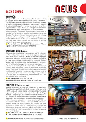 Com quase 100 anos, uma das marcas de beleza mais queridas de Portugal, abriu uma loja no renovado Campo das Cebolas. Esta beauty kitchen revela-nos os produtos da Benamôr, através do seu irresistível design e fragrâncias, mas também a sua história através de fotografias e antigos anúncios expostos. Num espaço luminoso e clean, devolve-se o protagonismo merecido a uma marca icónica que nos acompanha há quase um século. 3 Nearing its 100 th anniversary, this beloved Portuguese brand of beauty products has opened a shop in the renovated Campo das Cebolas. The “beauty kitchen” displays Benamôr’s irresistibly designed products and fragrances and also its history via several photos and old advertisements. The airy and clean shop returns this iconic brand, which has been part of our lives for nearly a century, to centre stage where it belongs. 10G Rua dos Bacalhoeiros, 20 A · T. 218 003 037 · www.benamor1925.com segunda a sábado / monday to saturday 10h00-20h00