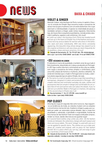 Uma loja de roupa em segunda mão como nunca viu. Aqui seguem-se as tendências da moda, as coleções mudam com as estações e encontramos marcas de luxo. A palavra vintage é usada com cuidado por poder ser associada a peças datadas. Aqui a roupa tem atualidade e, sobretudo, criatividade e originalidade, ficando de fora marcas de fast fashion! Tudo num espaço onde pode comprar, vender ou trocar, dando vida nova ao seu guarda roupa! 3 A second-hand clothes shop unlike any other. All the fashion trends are followed, the collections change with each season and there are luxury labels. The word 'vintage' is used with care so it can be applied to specific items. The clothes are up to date and, above all, creative and original, with no place for fast fashion brands! All in a place where you can buy, sell and swap to give your wardrobe a fresh lease of life! 5D Calçada do Sacramento, 48 · Tel. 216 096 251 · www.pop-closet.com segunda a sábado / monday to saturday 12h00-20h00
