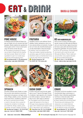 O ambiente descontraído do Hawai chegou ao Chiado com um conceito fast food saudável. Bowls repletos de ingredientes frescos para comer in loco ou levar para casa. Em breve um bar de açaí! 3 The laidback atmosphere of Hawaii has arrived in Chiado with this healthy fast food concept. Bowls full of fresh ingredients to eat in or to take away. An acai bar will be opening soon! 4D Rua da Misericórdia, 71 · FB: pokehouse.pt todos os dias / open daily 12h00-22h00