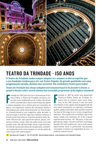 TEATRO DA TRINDADE · 150 ANOS O Teatro da Trindade soube sempre adaptar-se e manter-se fiel ao espírito que o seu fundador sonhou para ele: um Teatro Popular de grande qualidade com uma programação variada, distinta mas acessível. Um verdadeiro Teatro para todos! Teatro da Trindade has always adapted and remained loyal to its founder’s dream: a people’s theatre with a varied, distinct but accessible programme of the highest standard!