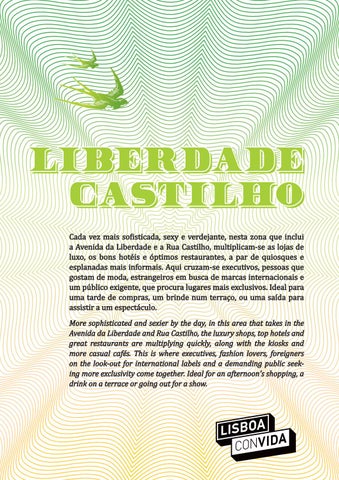 LIBERDADE CASTILHO Cada vez mais sofisticada, sexy e verdejante, nesta zona que inclui a Avenida da Liberdade e a Rua Castilho, multiplicam-se as lojas de luxo, os bons hotéis e óptimos restaurantes, a par de quiosques e esplanadas mais informais. Aqui cruzam-se executivos, pessoas que gostam de moda, estrangeiros em busca de marcas internacionais e um público exigente, que procura lugares mais exclusivos. Ideal para uma tarde de compras, um brinde num terraço, ou uma saída para assistir a um espectáculo.