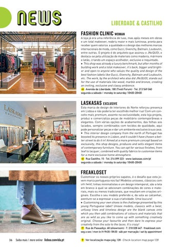 Esta marca de design de interiores do Norte reforçou presença em Lisboa e não poderia ter escolhido melhor rua! Com um conceito mais premium, assente na exclusividade, esta loja projeta, produz e comercializa peças de mobiliário contemporâneas e elegantes. Com várias opções de acabamentos, das folhas aos lacados, sempre combinados com tecidos de qualidade, aqui pode personalizar peças e dar um ambiente exclusivo à sua casa. 3 This interior design company from the north of Portugal has boosted its presence in Lisbon, and it couldn’t have chosen a better street to do it in! Aimed at a more premium concept based on exclusivity, this shop designs, produces and sells elegant items of contemporary furniture. You can opt for various finishes, from leaf to lacquer, combined with quality fabrics to customise items for a more exclusive home atmosphere. 4E Rua Castilho, 15 · Tel. 214 099 223 · www.laskasas.com/pt segunda a sábado / monday to saturday 10h00-20h00
