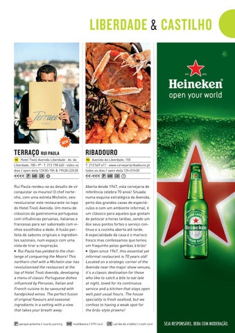 Aberta desde 1947, esta cervejaria de referência celebra 70 anos! Situada numa esquina estratégica da Avenida, perto das grandes casas de espectáculos e com um ambiente informal, é um clássico para aqueles que gostam de petiscar a horas tardias, sendo um dos seus pontos fortes o serviço contínuo e a cozinha aberta até tarde. A especialidade da casa é o marisco fresco mas confessamos que temos um fraquinho pelas gambas à brás! 3 Open since 1947, this essential yet informal restaurant is 70 years old! Located on a strategic corner of the Avenida near the major show venues, it’s a classic destination for those who like to catch a bite to eat late at night, loved for its continuous service and a kitchen that stays open well past usual hours. The house speciality is fresh seafood, but we confess to having a weak spot for the brás-style prawns!