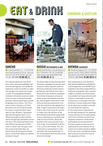 Um clássico aberto há mais de 50 anos. Uma cozinha de qualidade, tipicamente portuguesa, num ambiente tradicional, onde se mantêm os cadeirões de pele e as mesas com toalha e saiote. Os empregados fardados, continuam eficientes no serviço e atenciosos no trato. A ementa é variada: bacalhau, cabrito, peixe fresco, açorda de gambas entre outros… Por fim e, como manda a tradição, o carrinho dos doces fará uma visita às mesas. 3 A classic restaurant that’s been open for over 50 years. Top-quality typically Portuguese food in a traditional atmosphere where leather chairs and typically laid tables remain the norm. The uniformed waiters are still efficient and attentive and the menu is varied: salt cod, goat, fresh fish, prawn and bread stew, etc. And to finish off, the dessert trolley does a round of the tables as tradition dictates it should.