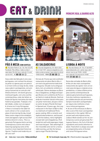 Há mais de 10 anos que este acolhedor restaurante em pleno Bairro Alto, é um marco da gastronomia tradicional portuguesa. Situado numa antiga padaria, tem um ambiente romântico e sofisticado. Damos destaque ao Bacalhau à Salgadeiras, às Migas de Espargos Bravos com Lombinhos de Porco e ao Cabrito à moda de Monção. Desfrute ainda da irresistível lista de vinhos para um jantar memorável, até para o famoso cantor de ópera Placido Domingo! 3 Opened over 10 years ago, this cosy restaurant in the heart of Bairro Alto is a hallmark of traditional Portuguese cooking. With a romantic and sophisticated ambience, and housed in a former bakery, menu highlights include Salt cod à Salgadeiras, Pork tenderloin with wild asparagus migas and roast kid goat. Take advantage of the irresistible wine list for a memorable evening, just like the famous opera singer Placido Domingo.