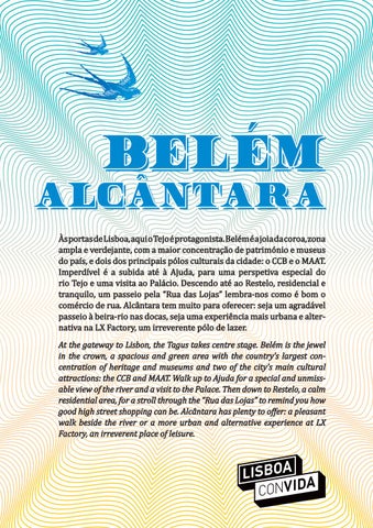 ALCANTARA Às portas de Lisboa, aqui o Tejo é protagonista. Belém é a joia da coroa, zona ampla e verdejante, com a maior concentração de património e museus do país, e dois dos principais pólos culturais da cidade: o CCB e o MAAT. Imperdível é a subida até à Ajuda, para uma perspetiva especial do rio Tejo e uma visita ao Palácio. Descendo até ao Restelo, residencial e tranquilo, um passeio pela “Rua das Lojas” lembra-nos como é bom o comércio de rua. Alcântara tem muito para oferecer: seja um agradável passeio à beira-rio nas docas, seja uma experiência mais urbana e alternativa na LX Factory, um irreverente pólo de lazer.