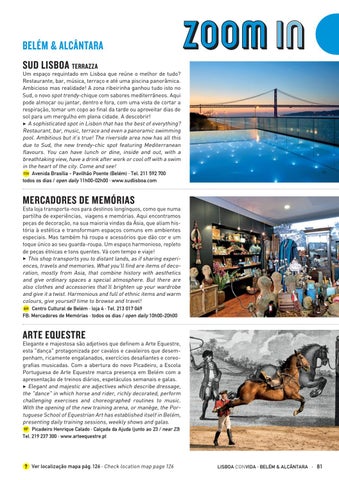 Um espaço requintado em Lisboa que reúne o melhor de tudo? Restaurante, bar, música, terraço e até uma piscina panorâmica. Ambicioso mas realidade! A zona ribeirinha ganhou tudo isto no Sud, o novo spot trendy-chique com sabores mediterrâneos. Aqui pode almoçar ou jantar, dentro e fora, com uma vista de cortar a respiração, tomar um copo ao final da tarde ou aproveitar dias de sol para um mergulho em plena cidade. A descobrir! 3 A sophisticated spot in Lisbon that has the best of everything? Restaurant, bar, music, terrace and even a panoramic swimming pool. Ambitious but it’s true! The riverside area now has all this due to Sud, the new trendy-chic spot featuring Mediterranean flavours. You can have lunch or dine, inside and out, with a breathtaking view, have a drink after work or cool off with a swim in the heart of the city. Come and see! 11H Avenida Brasília - Pavilhão Poente (Belém) · Tel. 211 592 700 todos os dias / open daily 11h00-02h00 · www.sudlisboa.com