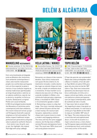 Com uma localização privilegiada junto ao Mosteiro dos Jerónimos, num ambiente contemporâneo e clean, este recente restaurante propõe-nos cozinha típica portuguesa com um foco especial no peixe e marisco. A sua confeção respeita as receitas tradicionais aperfeiçoadas ao longo de gerações e valoriza-se os sabores autênticos, seja do mar ou da terra, na grelha, no forno ou no tacho. Destacamos a original Perdiz com couve lombarda. 3 With its privileged location beside the Monastery of Jerónimos and a contemporary and clean ambience, this recent restaurant serves up typical Portuguese food with a special emphasis on fish and seafood. The dishes respect traditional recipes perfected over generations and great value is placed on authentic flavours - from land or sea, the grill, oven or pot. Our highlight: the original Partridge with savoy cabbage.