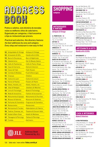 Rua de São Bento, 281 São Bento · Tel. 21 395 4102 SÃO ROQUE TOO 3D Rua de São Bento, 269 São Bento · Tel. 21 397 0197 SOLAR 8E Rua Dom Pedro V, 70 Príncipe Real · Tel. 21 346 5522 VINTAGE DEPARTMENT 6C Rua da Escola Politécnica, 46 Príncipe Real · Tel. 911 778 837 www.vintage-department.com YOYO OBJECTS 4C Rua Arco a São Mamede, 87 A Príncipe Real · Tel. 21 847 4653 Facebook: Yoyo objects ZARCO ANTIQUES AND ART GALLERY 4D Rua Marcos Portugal, 34 Príncipe Real · Tel. 914 012 633 www.zarcoantiques.com
