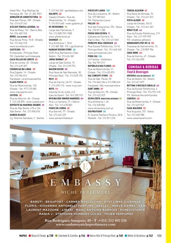 PIECES BY LAURA 15F Rua da Junqueira, 38 · Belém Tel. 927 509 862 FB: Pieces-by-Laura POLLUX 8D Rua dos Fanqueiros, 276 · Baixa Tel. 218 811 200 PREGO SEM ESTOPA 7I Calçada do Combro, 36 Bairro Alto · Tel. 213 421 583 PRÍNCIPE REAL ENXOVAIS 6D Rua Escola Politécnica, 12-14 Príncipe Real · Tel. 213 465 945 www.principereal.com PURA CAL 12A LX Factory · Alcântara Tel. 966 781 511 REPÚBLICA DAS FLORES 4D Rua da Misericórdia, 31 Chiado · Tel. 213 425 073 SAL CONCEPT STORE 2G Rua de São Paulo, 98 Tel. 916 065 104 e 213 900 269 Facebook: SAL-concept-store SANT’ANNA 3F Rua do Alecrim, 95 · Chiado Tel. 213 422 537 SILVIA COSTA ARQUITETURA INTERIORES 3B Rua Artilharia 1, 45 Tel. 214 830 056 www.silviacosta.com.pt SOLPRATEADO 2G R. Duarte Pacheco Pereira, 30 B Restelo · Tel. 213 011 235