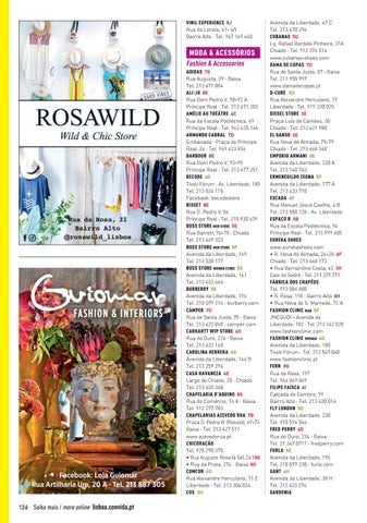 MODA & ACESSÓRIOS Fashion & Accessories ADIDAS 7G Rua Augusta, 39 · Baixa Tel. 213 471 084 ALI-JO 8E Rua Dom Pedro V, 90-92 A Príncipe Real · Tel. 213 471 203 AMÉLIE AU THÉÂTRE 6C Rua da Escola Politécnica, 69 Príncipe Real · Tel. 962 635 144 ARMANDO CABRAL 7D Embaixada · Praça do Príncipe Real, 26 · Tel. 969 623 836 BARBOUR 8E Rua Dom Pedro V, 93-95 Príncipe Real · Tel. 213 477 251 BECODE 6G Tivoli Fórum · Av. Liberdade, 180 Tel. 213 524 115 Facebook: becodestore BISSET 8E Rua D. Pedro V, 56 Príncipe Real · Tel. 215 930 639 BOSS STORE MEN STORE 5E Rua Garrett, 76-78 · Chiado Tel. 213 469 323 BOSS STORE MEN STORE 5F Avenida da Liberdade, 169 Tel. 213 530 177 BOSS STORE WOMEN STORE 5G Avenida da Liberdade, 141 Tel. 213 433 664 BURBERRY 5E Avenida da Liberdade, 196 Tel. 210 079 216 · burberry.com CAMPER 7D Rua de Santa Justa, 78 · Baixa Tel. 213 422 068 · camper.com CARHARTT WIP STORE 6D Rua do Ouro, 224 · Baixa Tel. 213 433 168 CAROLINA HERRERA 6G Avenida da Liberdade, 144 B Tel. 213 259 294 CASA HAVANEZA 4E Largo do Chiado, 25 · Chiado Tel. 213 420 340 CHAPELARIA D’AQUINO 8G Rua do Comércio, 16 A · Baixa Tel. 912 277 783 CHAPELARIAS AZEVEDO RUA 7B Praça D. Pedro IV (Rossio), 69-73 Baixa · Tel. 213 427 511 www.azevedorua.pt CHICORAÇÃO Tel. 925 290 375 • Rua Augusto Rosa (à Sé), 24 10G • Rua da Prata, 274 · Baixa 8D COMCOR 6D Rua Alexandre Herculano, 11 E Liberdade · Tel. 213 304 024 COS 5H