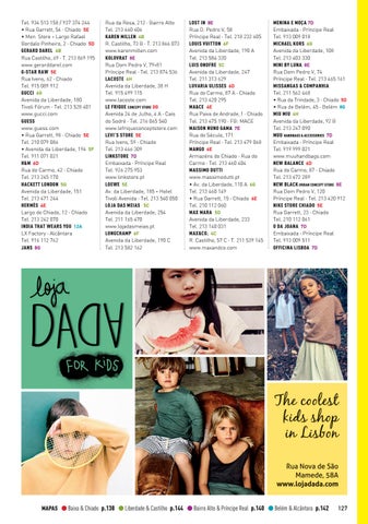 Rua da Rosa, 212 · Bairro Alto Tel. 213 460 406 KAREN MILLEN 4B R. Castilho, 73 B · T. 213 866 073 www.karenmillen.com KOLOVRAT 8E Rua Dom Pedro V, 79-81 Príncipe Real · Tel. 213 874 536 LACOSTE 6H Avenida da Liberdade, 38 H Tel. 915 499 115 www.lacoste.com LE FRIQUE CONCEPT STORE 0G Avenida 24 de Julho, 4 A · Cais do Sodré · Tel. 216 065 540 www.lefriqueconceptstore.com LEVI’S STORE 5E Rua Ivens, 59 · Chiado Tel. 213 466 309 LINKSTORE 7D Embaixada · Príncipe Real Tel. 926 275 953 www.linkstore.pt LOEWE 5E Av. da Liberdade, 185 - Hotel Tivoli Avenida · Tel. 213 540 050 LOJA DAS MEIAS 5C Avenida da Liberdade, 254 Tel. 211 165 470 www.lojadasmeias.pt LONGCHAMP 6F Avenida da Liberdade, 190 C Tel. 213 582 162
