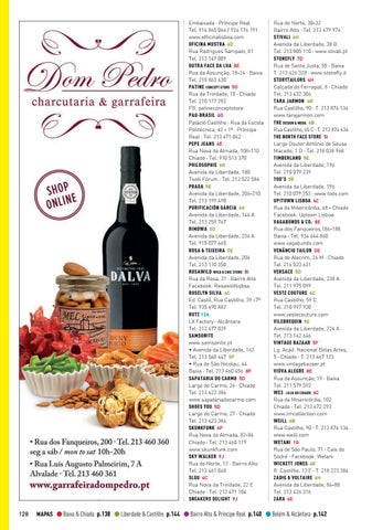 Rua do Norte, 30-32 Bairro Alto · Tel. 213 479 976 STIVALI 6H Avenida da Liberdade, 38 B Tel. 213 805 110 · www.stivali.pt STONEFLY 7D Rua de Santa Justa, 55 · Baixa T. 213 426 328 · www.stonefly.it STORYTAILORS 4H Calçada do Ferragial, 8 · Chiado Tel. 213 432 306 TARA JARMON 4B Rua Castilho, 90 · T. 213 874 134 www.tarajarmon.com THE DESIGN & MODA 4B Rua Castilho, 65 C · T. 213 874 434 THE NORTH FACE STORE 5i Largo Doutor António de Sousa Macedo, 1 D · Tel. 218 038 968 TIMBERLAND 5E Avenida da Liberdade, 196 Tel. 210 079 239 TOD’S 5E Avenida da Liberdade, 196 Tel. 210 079 253 · www tods.com UP!TOWN LISBOA 4C Rua da Misericórdia, 68 - Chiado Facebook: Uptown Lisboa VAGABUNDS & CO. 8E Rua dos Fanqueiros,186-188 Baixa · Tel. 934 644 860 www.vagabunds.com VENÂNCIO TAILOR 3G Rua do Alecrim, 26 M · Chiado Tel. 216 023 631 VERSACE 5D Avenida da Liberdade, 238 A Tel. 211 975 099 VESTE COUTURE 4C Rua Castilho, 59 C Tel. 210 997 930 www.vestecouture.com VILEBREQUIN 5E Avenida da Liberdade, 224 A Tel. 213 142 646 VINTAGE BAZAAR 5F Lg. Acad. Nacional Belas Artes, 5 · Chiado · T. 213 467 123 www.vintagebazaar.pt VIÚVA ALEGRE 8E Rua da Assunção, 19 · Baixa Tel. 211 579 592 WE3 - LOJA DO CHIADO 4C Rua da Misericórdia, 102 Chiado · Tel. 213 472 293 www.tmcollection.com WEILL 4B Rua Castilho, 90 · T. 213 874 134 www.weill.com WETANI 1G Rua de São Paulo, 71 · Cais do Sodré · Facebook: Wetani WICKETT JONES 4E R. Castilho, 13 E · T. 218 223 384 ZADIG & VOLTAIRE 6H Avenida da Liberdade, 84-88 Tel. 213 426 316 ZARA 6E