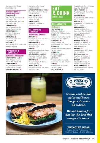 RESTAURANTES Restaurants 1300 TABERNA 12A LX Factory · Alcântara 213 649 170 · 1300taberna.com 2 GOOD! 1G R. Duarte Pacheco Pereira, 5C Restelo · Tel. 213 013 867 A CEVICHERIA 8E Rua D. Pedro V, 129 Príncipe Real · Tel. 218 038 815 À MARGEM 5i Doca do Bom Sucesso · Belém Tel. 918 620 032 A PRAÇA 12A LX Factory · Alcântara Tel. 210 991 792 ALFAIA 9H Travessa da Queimada, 22 Bairro Alto · Tel. 213 461 232 ALMA 5E Rua Anchieta, 15 · Chiado Tel. 213 470 650 ALTO DO SÉCULO 7E