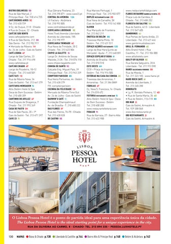 www.restaurantefidalgo.com FLORES DO BAIRRO BAIRRO ALTO HOTEL 3E Praça Luís de Camões, 8 Chiado · Tel. 213 408 252 FLORESTA DO SALITRE 5G Rua do Salitre, 42 D · Liberdade Tel. 213 547 605 GAMBRINUS 6J Rua Portas de Santo Antão, 23 Liberdade · Tel. 213 421 466 www.gambrinuslisboa.com GRILL D. FERNANDO 4E Altis Grand Hotel - Rua Castilho, 11 · Tel. 213 106 000 www.altishotels.com GUILTY BY OLIVIER 5E Rua Barata Salgueiro, 28 A Liberdade · Tel. 211 913 590 HANSI SALSICHARIA VIENENSE 0G Rua da Moeda, 1 Tel. 211 323 185 · www.hansi.pt HARD ROCK CAFÉ 6I Avenida da Liberdade, 2 Tel. 213 245 280 HONORATO • Lg. R. Bordalo Pinheiro, 12 4D • Rua de Santa Marta, 35 6D • Rua de Belém, 116-118 8G IBO MAR 2i Cais do Sodré, Armazém A Tel. 929 308 068 www.ibo-restaurante.pt IBO RESTAURANTE 2i Cais do Sodré, Armazém A