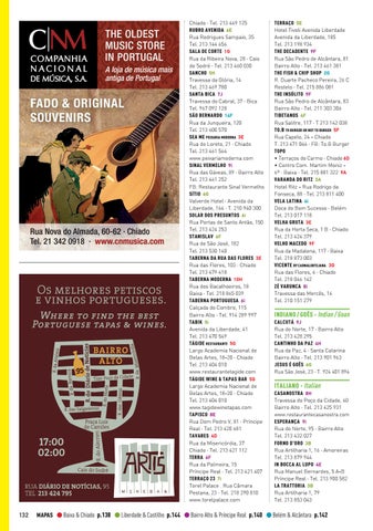 Chiado · Tel. 213 469 125 RUBRO AVENIDA 6E Rua Rodrigues Sampaio, 35 Tel. 213 144 656 SALA DE CORTE 1G Rua da Ribeira Nova, 28 · Cais do Sodré · Tel. 213 460 030 SANCHO 5H Travessa da Glória, 14 Tel. 213 469 780 SANTA BICA 7J Travessa do Cabral, 37 · Bica Tel. 967 092 128 SÃO BERNARDO 14F Rua da Junqueira, 120 Tel. 213 600 570 SEA ME PEIXARIA MODERNA 3E Rua do Loreto, 21 · Chiado Tel. 213 461 564 www.peixariamoderna.com SINAL VERMELHO 9i Rua das Gáveas, 89 · Bairro Alto Tel. 213 461 252 FB: Restaurante Sinal Vermelho SÍTIO 6G Valverde Hotel · Avenida da Liberdade, 164 · T. 210 940 300 SOLAR DOS PRESUNTOS 6i Rua Portas de Santo Antão, 150 Tel. 213 424 253 STANISLAV 6F Rua de São José, 182 Tel. 213 530 140 TABERNA DA RUA DAS FLORES 3E Rua das Flores, 103 · Chiado Tel. 213 479 418 TABERNA MODERNA 10H Rua dos Bacalhoeiros, 18 Baixa · Tel. 218 865 039 TABERNA PORTUGUESA 6i Calçada do Combro, 115 Bairro Alto · Tel. 914 289 997 TABIK 5i Avenida da Liberdade, 41 Tel. 213 470 549 TÁGIDE RESTAURANTE 5G Largo Academia Nacional de Belas Artes, 18-20 · Chiado Tel. 213 404 010 www.restaurantetagide.com TÁGIDE WINE & TAPAS BAR 5G Largo Academia Nacional de Belas Artes, 18-20 · Chiado Tel. 213 404 010 www.tagidewinetapas.com TAPISCO 8E Rua Dom Pedro V, 81 · Príncipe Real · Tel. 213 420 681 TAVARES 4D Rua da Misericórdia, 37 Chiado · Tel. 213 421 112 TERRA 6F Rua da Palmeira, 15 Príncipe Real · Tel. 213 421 407 TERRAÇO 23 7i Torel Palace . Rua Câmara Pestana, 23 · Tel. 218 290 810 www.torelpalace.com