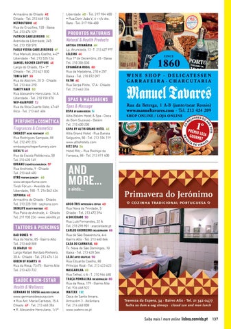 PERFUMES & COSMÉTICA Fragrances & Cosmetics EMBASSY NICHE PERFUMERY 6D Rua Rodrigues Sampaio, 88 Tel. 212 492 226 embassynicheperfumery.com KIEHL’S 6C Rua da Escola Politécnica, 50 Tel. 213 420 149 ORGANII COSMÉTICA BIOLÓGICA 5F Rua Anchieta, 9 · Chiado Tel. 213 468 403 OTRO PERFUME CONCEPT 6G www.otroperfume.com Tivoli Fórum · Avenida da Liberdade, 180 · T. 216 062 636 SEPHORA 6E Armazéns do Chiado · Chiado Tel. 213 225 188 · sephora.com SKINLIFE BEAUTY BOUTIQUE 4E Rua Paiva de Andrade, 4 · Chiado Tel. 211 930 236 · www.skinlife.pt