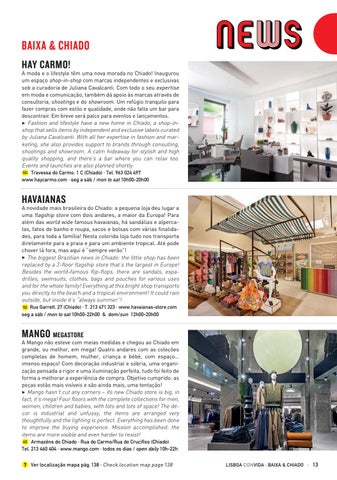 A novidade mais brasileira do Chiado: a pequena loja deu lugar a uma flagship store com dois andares, a maior da Europa! Para além das world wide famous havaianas, há sandálias e alpercatas, fatos de banho e roupa, sacos e bolsas com várias finalidades, para toda a família! Nesta colorida loja tudo nos transporta diretamente para a praia e para um ambiente tropical. Até pode chover lá fora, mas aqui é “sempre verão”! 3 The biggest Brazilian news in Chiado: the little shop has been replaced by a 2-floor flagship store that’s the largest in Europe! Besides the world-famous flip-flops, there are sandals, espadrilles, swimsuits, clothes, bags and pouches for various uses and for the whole family! Everything at this bright shop transports you directly to the beach and a tropical environment! It could rain outside, but inside it’s “always summer”! 5E Rua Garrett, 27 (Chiado) · T. 213 471 323 · www.havaianas-store.com seg a sáb / mon to sat 10h00-22h00 & dom/sun 12h00-20h00