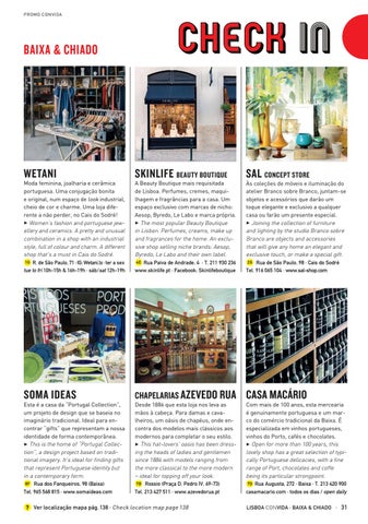 Com mais de 100 anos, esta mercearia é genuinamente portuguesa e um marco do comércio tradicional da Baixa. É especializada em vinhos portugueses, vinhos do Porto, cafés e chocolates. 3 Open for more than 100 years, this lovely shop has a great selection of typically Portuguese delicacies, with a fine range of Port, chocolates and coffe being its particular strongpoint. 7D Rua Augusta, 272 · Baixa · T. 213 420 900 casamacario.com · todos os dias / open daily LISBOA CON VIDA · BAIXA & CHIADO · 31