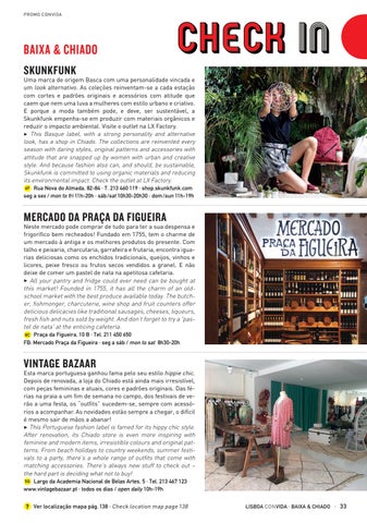 Uma marca de origem Basca com uma personalidade vincada e um look alternativo. As coleções reinventam-se a cada estação com cortes e padrões originais e acessórios com atitude que caem que nem uma luva a mulheres com estilo urbano e criativo. E porque a moda também pode, e deve, ser sustentável, a Skunkfunk empenha-se em produzir com materiais orgânicos e reduzir o impacto ambiental. Visite o outlet na LX Factory. 3 This Basque label, with a strong personality and alternative look, has a shop in Chiado. The collections are reinvented every season with daring styles, original patterns and accessories with attitude that are snapped up by women with urban and creative style. And because fashion also can, and should, be sustainable, Skunkfunk is committed to using organic materials and reducing its environmental impact. Check the outlet at LX Factory. 6F Rua Nova do Almada, 82-84 · T. 213 460 119 · shop.skunkfunk.com seg a sex / mon to fri 11h-20h · sáb /sat 10h30-20h30 · dom /sun 11h-19h