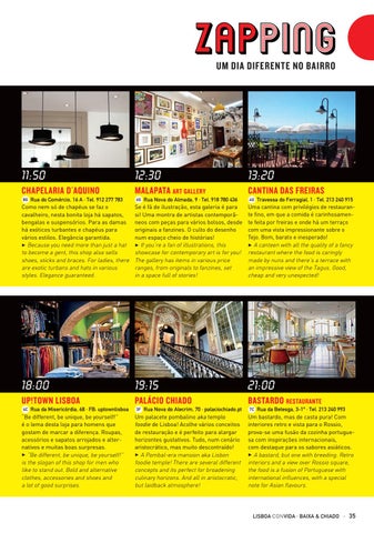 Rua da Misericórdia, 68 · FB: uptownlisboa “Be different, be unique, be yourself!” é o lema desta loja para homens que gostam de marcar a diferença. Roupas, acessórios e sapatos arrojados e alternativos e muitas boas surpresas. 3 “Be different, be unique, be yourself!” is the slogan of this shop for men who like to stand out. Bold and alternative clothes, accessories and shoes and a lot of good surprises.