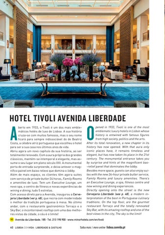 pened in 1933, Tivoli is one of the most emblematic luxury hotels in Lisbon whose history is entwined with famous figures from high society, politics and the arts. After its total renovation, a new chapter in its history has now opened. With that aura only iconic places have, it remains timeless and elegant, but has now taken its place in the 21st century. The monumental entrance takes you by surprise and hints at the magnificent bas-relief panel that dominates the lobby. Besides more space, guests can also enjoy suites with the new 24-hour private butler service, Family Rooms and luxury amenities. There’s an Executive Lounge, a spa, fitness centre and new wining and dining experiences. Directly opening onto the street is the new Cervejaria Liberdade (see p. 48), a modern interpretation of the best in Portuguese culinary traditions. On the top floor, are the gourmet restaurant Terraço and the totally renovated Sky Bar, with its amazing rooftop and one of the best views in the city, The sky is the limit!