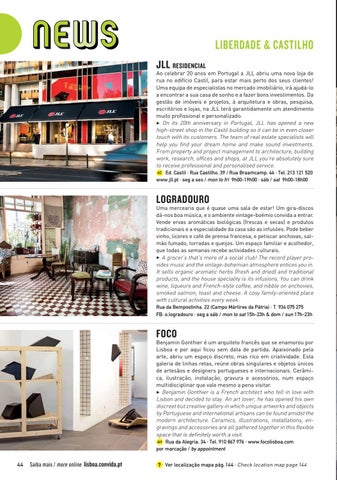 Ao celebrar 20 anos em Portugal a JLL abriu uma nova loja de rua no edifício Castil, para estar mais perto dos seus clientes! Uma equipa de especialistas no mercado imobiliário, irá ajudá-lo a encontrar a sua casa de sonho e a fazer bons investimentos. Da gestão de imóveis e projetos, à arquitetura e obras, pesquisa, escritórios e lojas, na JLL terá garantidamente um atendimento muito profissional e personalizado. 3 On its 20th anniversary in Portugal, JLL has opened a new high-street shop in the Castil building so it can be in even closer touch with its customers. The team of real estate specialists will help you find your dream home and make sound investments. From property and project management to architecture, building work, research, offices and shops, at JLL you’re absolutely sure to receive professional and personalised service. 4C Ed. Castil · Rua Castilho, 39 / Rua Braamcamp, 44 · Tel. 213 121 520 www.jll.pt · seg a sex / mon to fri 9h00-19h00 · sáb / sat 9h00-18h00