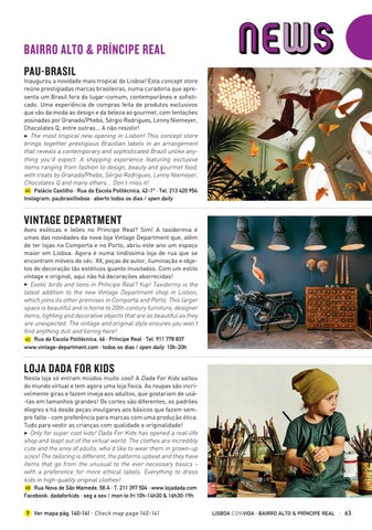 Nesta loja só entram miúdos muito cool! A Dada For Kids saltou do mundo virtual e tem agora uma loja física. As roupas são incrivelmente giras e fazem inveja aos adultos, que gostariam de usá-las em tamanhos grandes! Os cortes são diferentes, os padrões alegres e há desde peças invulgares aos básicos que fazem sempre falta - com preferência para marcas com uma produção ética. Tudo para vestir as crianças com qualidade e originalidade! 3 Only for super cool kids! Dada For Kids has opened a real-life shop and leapt out of the virtual world. The clothes are incredibly cute and the envy of adults, who’d like to wear them in grown-up sizes! The tailoring is different, the patterns upbeat and they have items that go from the unusual to the ever necessary basics – with a preference for more ethical labels. Everything to dress kids in high-quality original clothes! 6B Rua Nova de São Mamede, 58 A · T. 211 397 504 · www.lojadada.com Facebook: dadaforkids · seg a sex / mon to fri 10h-14h30 & 16h30-19h