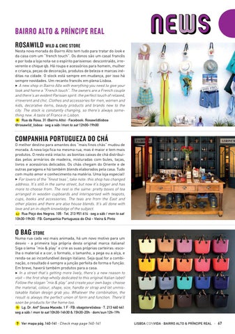 Nesta nova morada do Bairro Alto tem tudo para tratar do look e da casa com um “french touch”. Os donos são um casal francês e por toda a loja nota-se o espírito parisiense: descontraído, irreverente e chique qb. Há roupa e acessórios para homem, mulher e criança, peças de decoração, produtos de beleza e marcas inéditas na cidade. O stock está sempre em mudança, por isso há sempre novidades. Um recanto francês em plena Lisboa. 3 A new shop in Bairro Alto with everything you need to give your look and home a “French touch”. The owners are a French couple and there’s an evident Parisian spirit: the perfect touch of relaxed, irreverent and chic. Clothes and accessories for men, women and kids, decorative items, beauty products and brands new to the city. The stock is constantly changing, so there’s always something new. A taste of France in Lisbon. 8i Rua da Rosa, 31 (Bairro Alto) · Facebook: Rosawildlisboa @rosawild_lisboa · seg a sáb /mon to sat 12h00-19h00