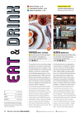 Comida típica para ser degustada a horas próprias e impróprias. Peixes, carnes e mariscos confecionados à boa moda portuguesa. Polvo à lagareiro, leitão assado, açorda de gambas e uma extensa lista de pecaminosas sobremesas bem tradicionais. Além dos pratos há um vasto menu de petiscos que podem ser pedidos em 3 tamanhos diferentes: entrada, dose ou travessa. Pertence aos donos do Alfaia... já sabe com o que conta! 3 Typical food to be enjoyed at normal and less normal hours. Fish, meat and seafood prepared in timehonoured Portuguese fashion. Octopus ‘à lagareiro’, roast suckling pig, prawn ‘açorda’ and an extensive list of tempting traditional desserts. Besides the main courses, there’s a large menu of snacks that come in 3 sizes: starter, main dish or platter. ‘Aldeia’ belongs to the same owners as Alfaia... so you know what to expect!