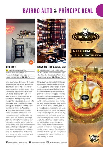Uma australiana do mundo da moda, apaixonou-se por Lisboa. Mudou-se de armas e bagagens e concretizou o sonho de abrir um bar. O tom é descontraído e o estilo industrial, com um mural de street art e um néon a dominarem a cena. Neste bar de cocktails, o destaque vai para as margaritas e outros clássicos da arte do shaker, mas também há cerveja portuguesa artesanal e vinhos, gins e whiskeys vindos da Austrália. 3 An Australian from the fashion world fell in love with Lisbon and moved lock, stock and barrel to the city to fulfil her dream of opening a bar. The atmosphere is relaxed and the style industrial, with a street art mural and a neon light dominating the decor. The highlight are the margaritas and other similar cocktail classics, but there are also Portuguese craft beers and different wines, gins and whiskeys from Australia.