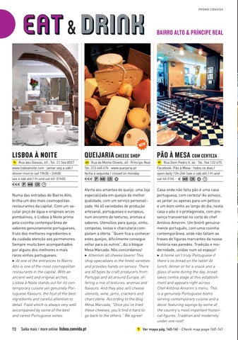 Alerta aos amantes de queijo: uma loja especializada em queijos da melhor qualidade, com um serviço personalizado. Há 60 variedades de produção artesanal, portugueses e europeus, num encontro de texturas, aromas e sabores. Utensílios para queijo, vinho, compotas, tostas e charcutaria completam a oferta. “Quem fica a conhecer estes queijos, dificilmente consegue voltar para os outros”, diz o blogue Mesa Marcada. Nós concordamos! 3 Attention all cheese lovers! This shop specialises in the finest varieties and provides hands on service. There are 60 types by craft producers from Portugal and all around Europe, offering a mix of textures, aromas and flavours. And they also sell cheese utensils, wine, jams, crackers and charcuterie. According to the blog Mesa Marcada, “Once you’ve tried these cheeses, you’ll find it hard to go back to the others.” We agree!