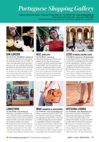 Tel. 916 865 066 · www.officinalisboa.com Descubra as coleções intemporais desta marca portuguesa de sapatos, com linhas clássicas aliadas a um design minimalista, às quais se juntam os ténis JAK. Para homem e senhora! 3 Discover the timeless collections of this Portuguese shoe brand with its classic styles and minimalist design, and don’t forget to take a look at the JAK trainers too. For men and women! LISBOA CON VIDA · PRÍNCIPE REAL · 79