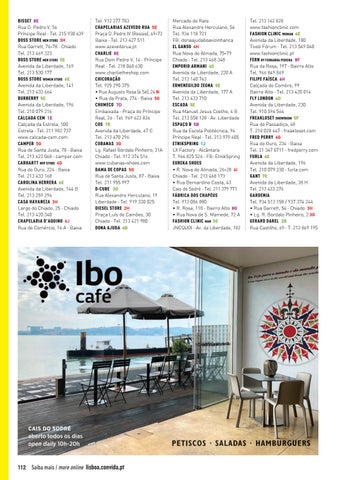 BISSET 8E Rua D. Pedro V, 56 Príncipe Real · Tel. 215 930 639 BOSS STORE MEN STORE 3H Rua Garrett, 76-78 · Chiado Tel. 213 469 323 BOSS STORE MEN STORE 5E Avenida da Liberdade, 169 Tel. 213 530 177 BOSS STORE WOMEN STORE 6E Avenida da Liberdade, 141 Tel. 213 433 664 BURBERRY 5E Avenida da Liberdade, 196 Tel. 210 079 216 CALÇADA CEM 1E Calçada da Estrela, 100 Estrela · Tel. 211 982 737 www.calcada-cem.com CAMPER 5G Rua de Santa Justa, 78 · Baixa Tel. 213 422 068 · camper.com CARHARTT WIP STORE 4G Rua do Ouro, 224 · Baixa Tel. 213 433 168 CAROLINA HERRERA 6E Avenida da Liberdade, 144 B Tel. 213 259 294 CASA HAVANEZA 3H Largo do Chiado, 25 · Chiado Tel. 213 420 340 CHAPELARIA D’AQUINO 6J Rua do Comércio, 16 A · Baixa