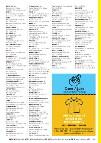 G-STAR RAW 3H Rua Ivens, 62 · Chiado T. 915 089 912 · www.g-star.com GUCCI 6E Avenida da Liberdade, 180 Tivoli Fórum · Tel. 213 528 401 GUESS • Rua Garrett, 98 · Chiado 3H Tel. 210 079 086 • Avenida da Liberdade, 194 5E Tel. 911 071 021 HACKETT LONDON 6E Avenida da Liberdade, 151 Tel. 213 471 244 HAY CARMO! 3G Travessa do Carmo, 1 C Tel. 963 024 497 HERMÈS 2H Largo do Chiado, 12 · Chiado Tel. 213 242 070 INDIA THAT WEARS YOU 1J LX Factory · Alcântara Tel. 916 112 762 JANS 8F Rua da Rosa, 212 · Bairro Alto Tel. 213 460 406 KAREN MILLEN 2B R. Castilho, 73 B · T. 213 866 073 www.karenmillen.com KOLOVRAT 8E Rua Dom Pedro V, 79-81 Príncipe Real · Tel. 213 874 536 LACOSTE 7F Avenida da Liberdade, 38 H Tel. 915 499 115 www.lacoste.com LE FRIQUE CONCEPT STORE 6K Avenida 24 de Julho, 4 A · Cais do Sodré · Tel. 216 065 540 LES AILES ENCHAINÉES 1F Rua da Bela Vista à Lapa, 22 Tel. +336 624 996 67 www.lesailesenchainees.com LEVI’S STORE 3H Rua Ivens, 59 · Chiado Tel. 213 466 309 LINKSTORE 7D Embaixada · Príncipe Real Tel. 926 275 953 LOEWE 4D Av. da Liberdade, 185 - Hotel Tivoli Avenida · Tel. 213 540 050 LOJA DAS MEIAS 3D Avenida da Liberdade, 254 Tel. 211 165 470 www.lojadasmeias.pt LONGCHAMP 5E Avenida da Liberdade, 190 C Tel. 213 582 162 LOST IN 8E Rua D. Pedro V, 58 Príncipe Real · Tel. 218 232 605 LOUIS VUITTON 5E Avenida da Liberdade, 190 A Tel. 213 584 320 LUIS ONOFRE 3D Avenida da Liberdade, 247 Tel. 211 313 629