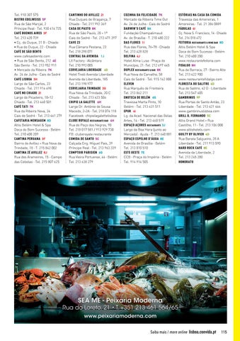 CANTINHO DO AVILLEZ 2I Rua Duques de Bragança, 7 Chiado · Tel. 211 992 369 CASA DE PASTO 8K Rua de São Paulo, 20 - 1º Cais do Sodré · Tel. 213 471 397 CAVE 23 Rua Câmara Pestana, 23 Tel. 218 298 071 CENTRAL DA AVENIDA 1J LX Factory · Alcântara Tel. 210 993 005 CERVEJARIA LIBERDADE 4D Hotel Tivoli Avenida Liberdade Avenida da Liberdade, 185 Tel. 213 198 977 CERVEJARIA TRINDADE 3G Rua Nova da Trindade, 20 C Chiado · Tel. 213 423 506 CHIPIE LA GALETTE 6H Largo Dr. António de Sousa Macedo, 2-2A · Tel. 218 074 118 Facebook: chipielagalettelisboa CLUBE ROYALE RESTAURANTE BAR 4H Rua do Poço dos Negros, 90 Tel. 218 017 581 / 913 929 730 FB: cluberoyale.restaurante COMIDA DE SANTO 5C Calçada Eng. Miguel Pais, 39 Príncipe Real · Tel. 213 963 339 COMPTOIR PARISIEN 6G Rua Vieira Portuense, 44 · Belém Tel. 213 638 279
