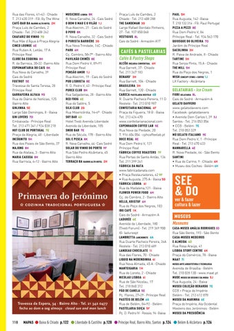CAFÉS & PASTELARIAS Cafés & Pastry Shops ALCÔA DOÇARIA CONVENTUAL 4H Rua Garrett, 37 · Chiado Tel. 211 367 183 BENARD’ 3H Rua Garrett, 104 · Chiado BRASILEIRA 3H Rua Garrett, 120 · Chiado CARECA PASTELARIA RESTELO 6B R. Duarte Pacheco Pereira, 11 D Restelo · Tel. 213 010 987 CONFEITARIA NACIONAL 6F Praça da Figueira, 18 B · Baixa Tel. 213 424 470 www.confeitarianacional.com COPENHAGEN COFFEE LAB 5E Rua Nova da Piedade, 20 T. 916 604 054 · cphcoffeelab.pt DOCE REAL 8E Rua Dom Pedro V, 121 Príncipe Real FÁBRICA COFFEE ROASTERS 7F Rua Portas de Santo Antão, 136 Tel. 211 399 261 FÁBRICA DA NATA www.fabricadanata.com • Praça Restauradores, 62 9F • Rua Augusta, 275 A · Baixa 5G FÁBRICA LISBOA 6I Rua da Madalena,121 · Baixa FLOWER POWER FOOD 6H Cç. do Combro, 2 · Bairro Alto HELLO, KRISTOF 4H Rua do Poço dos Negros, 103 IBO CAFÉ 1K Cais do Sodré · Armazém A LADURÉE 6E Avenida da Liberdade, 180 (Tivoli Forum) · Tel. 219 369 900 IG: ladureept LAMBRETTA LANCHONETE 6A Rua Duarte Pacheco Pereira, 26A Restelo · Tel. 213 010 489 LANDEAU CHOCOLATE 1I Rua das Flores, 70 · Chiado LIQUID NA MERENDINHA 4I Rua Nova Almada, 45 A · Chiado MANTEIGARIA 1H Rua do Loreto, 2 · Chiado NICOLAU LISBOA 6I Rua de São Nicolau, 17 Tel. 218 860 312 PÃO DE CANELA 5E Pç. Flores, 27-29 · Príncipe Real PASTÉIS DE BELÉM 6G Rua de Belém, 84-92 · Belém PASTELARIA SUIÇA 5F Pç. D. Pedro IV · Rossio, 96 · Baixa