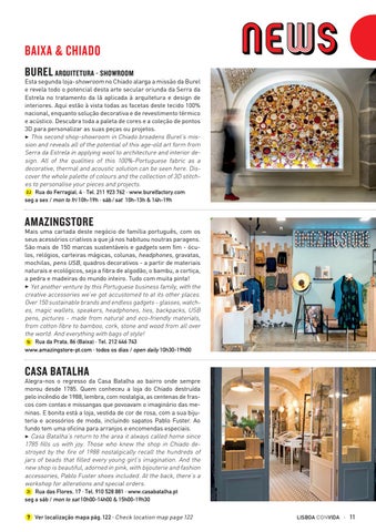 Mais uma cartada deste negócio de família português, com os seus acessórios criativos a que já nos habituou noutras paragens. São mais de 150 marcas sustentáveis e gadgets sem fim - óculos, relógios, carteiras mágicas, colunas, headphones, gravatas, mochilas, pens USB, quadros decorativos - a partir de materiais naturais e ecológicos, seja a fibra de algodão, o bambu, a cortiça, a pedra e madeiras do mundo inteiro. Tudo com muita pinta! 3 Yet another venture by this Portuguese business family, with the creative accessories we’ve got accustomed to at its other places. Over 150 sustainable brands and endless gadgets - glasses, watches, magic wallets, speakers, headphones, ties, backpacks, USB pens, pictures - made from natural and eco-friendly materials, from cotton fibre to bamboo, cork, stone and wood from all over the world. And everything with bags of style! 5i Rua da Prata, 86 (Baixa) · Tel. 212 446 743 www.amazingstore-pt.com · todos os dias / open daily 10h30-19h00