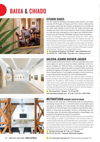 Um dos negócios familiares de sapatos para homem com mais sucesso em Portugal, extravasou por fim o online e abre portas nas antigas cavalariças dos Duques de Bragança, num prédio do séc. XVII, onde a pedra à vista só vem dar ainda mais pinta aos modelos da marca. Dos mais casual ao mais formais, todos têm um charme muito cosmopolita, com origem nas imbatíveis fábricas do norte de Portugal. Qualidade a preços muito acessíveis. 3 One of Portugal’s most successful family-run mens’ shoes businesses has finally gone online and also opened its doors in the old stables of the Dukes of Bragança, in a 17th-century building where the visible stone only adds an extra sheen to its footwear. From the more casual models to the more formal, all have a very cosmopolitan charm rooted in northern Portugal’s unbeatable factories. Quality at very reasonable prices. 2i Rua Duques de Bragança, 5 B (Chiado) · www.citadinshoes.com Tel. 967 073 176 · 11h00-19h00 - fecha dom e ter / closed sun & tue