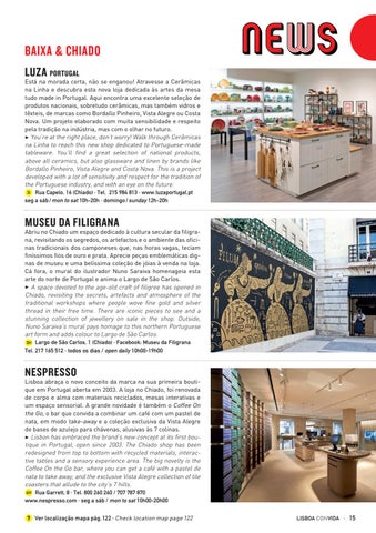 Lisboa abraça o novo conceito da marca na sua primeira boutique em Portugal aberta em 2003. A loja no Chiado, foi renovada de corpo e alma com materiais reciclados, mesas interativas e um espaço sensorial. A grande novidade é também o Coffee On the Go, o bar que convida a combinar um café com um pastel de nata, em modo take-away e a coleção exclusiva da Vista Alegre de bases de azulejo para chávenas, alusivas às 7 colinas. 3 Lisbon has embraced the brand’s new concept at its first boutique in Portugal, open since 2003. The Chiado shop has been redesigned from top to bottom with recycled materials, interactive tables and a sensory experience area. The big novelty is the Coffee On the Go bar, where you can get a café with a pastel de nata to take away, and the exclusive Vista Alegre collection of tile coasters that allude to the city’s 7 hills. 4H Rua Garrett, 8 · Tel. 800 260 260 / 707 787 870 www.nespresso.com · seg a sáb / mon to sat 10h00-20h00