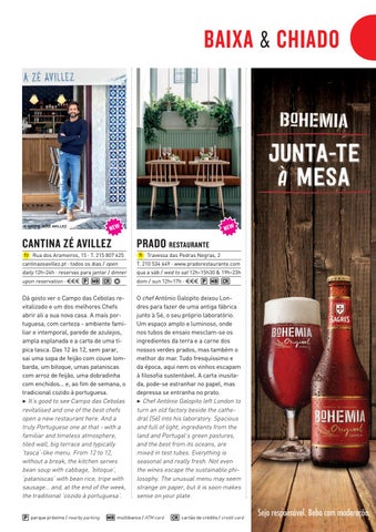 Dá gosto ver o Campo das Cebolas revitalizado e um dos melhores Chefs abrir ali a sua nova casa. A mais portuguesa, com certeza - ambiente familiar e intemporal, parede de azulejos, ampla esplanada e a carta de uma típica tasca. Das 12 às 12, sem parar, sai uma sopa de feijão com couve lombarda, um bitoque, umas pataniscas com arroz de feijão, uma dobradinha com enchidos… e, ao fim de semana, o tradicional cozido à portuguesa. 3 It’s good to see Campo das Cebolas revitalised and one of the best chefs open a new restaurant here. And a truly Portuguese one at that - with a familiar and timeless atmosphere, tiled wall, big terrace and typically ‘tasca’-like menu. From 12 to 12, without a break, the kitchen serves bean soup with cabbage, ‘bitoque’, ‘pataniscas’ with bean rice, tripe with sausage… and, at the end of the week, the traditional ‘cozido à portuguesa’.