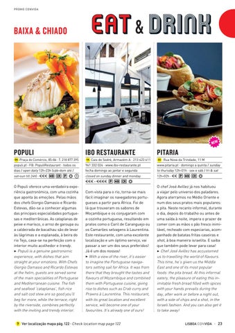 O chef José Avillez já nos habituou a viajar pelo universo dos paladares. Agora aterramos no Médio Oriente e num dos seus pratos mais populares: a pita. Neste recanto informal, durante o dia, depois do trabalho ou antes de uma saída à noite, impera o prazer de comer com as mãos o pão fresco inimitável, recheado com especiarias, acompanhado de batatas fritas caseiras e shot, à boa maneira israelita. E saiba que também pode levar para casa! 3 Chef José Avillez has accustomed us to travelling the world of flavours. This time, he’s given us the Middle East and one of its most popular foods: the pita bread. At this informal eatery, the pleasure of eating this inimitable fresh bread filled with spices with your hands prevails during the day, after work or before a night out, with a side of chips and a shot, in the Israeli fashion. And you can also get it to take away! LISBOA CON VIDA · 23
