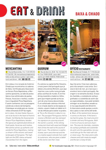 Aqui há carne. E da mais saborosa, pois trás sempre o osso atrás. Se o osso é duro de roer, já o naco que o envolve é tenro e bem português. Na origem e no tamanho da dose. O osso do chambão, a costeleta do cachaço grelhada e o costeletão do acém são as especialidades, mas pode também entregar-se ao bacalhau assado ou à rica sopa da pedra de Almeirim. A charcutaria vende queijos e enchidos a peso e o bar anima até tarde. 3 Meat, of the tastiest kind, because it comes on the bone. If the bone’s too hard to gnaw, the meat around it is tender and very Portuguese. Both in terms of source and size of portion. The osso do chambão, costeleta do cachaço grelhada and costeletão do acém are the specialities, but you could also go for the roast salt cod or stone soup. The charcuterie sells cheeses and cold meats by weight and the bar is lively till late.
