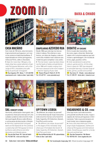 Uma loja muito cool onde encontra uma grande escolha de óculos, roupa e sapatos de marcas portuguesas e internacionais. Tudo o que precisa para um look trendy, livre e despreocupado. 3 A very cool shop where you’ll find a large range of eyeglasses, clothes and shoes by Portuguese and international labels. Everything you need for a trendy, free and carefree look. 6H Rua dos Fanqueiros, 186 (Baixa) Tel. 925 924 474 · www.vagabunds.com