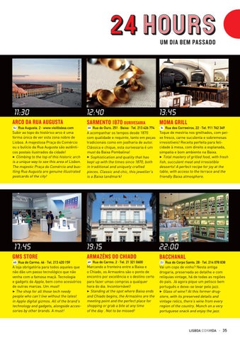 Rua do Carmo, 2 · Tel. 21 321 0600 Marcando a fronteira entre a Baixa e o Chiado, os Armazéns são o ponto de encontro por excelência e o destino certo para fazer umas compras a qualquer hora do dia. Incontornável! 3 Standing at the spot where Baixa ends and Chiado begins, the Armazéns are the meeting point and the perfect place for shopping or grab a bite at any time of the day . Not to be missed! 4H