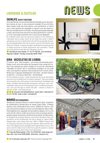 Uma loja Skinlife na zona da Avenida da Liberdade, perto das grandes marcas de luxo, é uma excelente novidade! À hora de fecho desta edição ainda não tinha aberto, mas partilhamos a notícia com a total garantia de qualidade e requinte com que Dennis e Patrick nos habituaram no Chiado. Uma beauty boutique dedicada a tudo o que há de mais exclusivo na haute parfumerie e cosmética. Crie o seu próprio perfume com o novo serviço Bespoke! 3 A Skinlife shop near the big luxury labels in the Avenida da Liberdade area is great news! As we close this issue, it hadn’t opened yet, but we’re sharing the info with the guarantee of quality and sophistication that we’ve grown used to with Dennis and Patrick in Chiado. A 'beauty boutique' dedicated to everything that is highly exclusive in haute parfumerie and cosmetics. Create your own perfume with the new 'Bespoke' service. 5E Rua Manuel Jesus Coelho, 12 · Tel. 211 930 236 · www.skinlife.pt segunda a sábado / monday to saturday 10h30-19h30