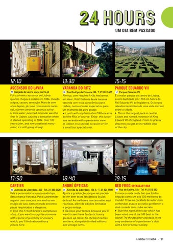 Avenida da Liberdade, 240 · Tel. 21 330 2420 Vale a pena visitar a sumpuosada loja desta marca francesa. Para surpreender alguém com uma jóia, um anel ou um relógio de luxo, nesta morada encontra peças requintadas e elegantes. 3 Visit this French brand’s sumptuous shop. If you want to surprise someone with a piece of jewellery or a luxury watch, you’ll find extraordinary pieces here.