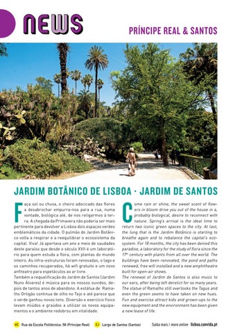 aça sol ou chuva, o cheiro adocicado das flores a desabrochar empurra-nos para a rua, numa vontade, biológica até, de nos religarmos à terra. A chegada da Primavera não poderia ser mais pertinente para devolver a Lisboa dois espaços verdes emblemáticos da cidade. O pulmão do Jardim Botânico volta a respirar e a reequilibrar o ecossistema da capital. Viva! Já apertava um ano e meio de saudades deste paraíso que desde o século XVII é um laboratório para quem estuda a flora, com plantas do mundo inteiro. As infra-estruturas foram renovadas, o lago e os caminhos recuperados, há wifi gratuito e um novo anfiteatro para espetáculos ao ar livre. Também a requalificação do Jardim de Santos (Jardim Nuno Álvares) é música para os nossos ouvidos, depois de tantos anos de abandono. A estátua de Ramalho Ortigão continua de olho no Tejo e até parece que o verde ganhou novos tons. Diversão e exercício físico levam miúdos e graúdos a utilizar os novos equipamentos e o ambiente redobrou em vitalidade. 6C Rua da Escola Politécnica, 58 (Príncipe Real)
