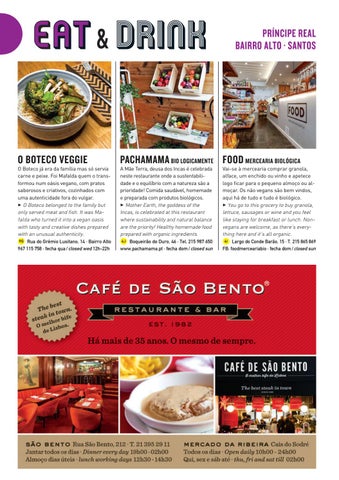 Vai-se à mercearia comprar granola, alface, um enchido ou vinho e apetece logo ficar para o pequeno almoço ou almoçar. Os não vegans são bem vindos, aqui há de tudo e tudo é biológico. 3 You go to this grocery to buy granola, lettuce, sausages or wine and you feel like staying for breakfast or lunch. Nonvegans are welcome, as there’s everything here and it’s all organic. 4i Largo do Conde Barão, 15 · T. 215 865 869 FB: foodmerceariabio · fecha dom / closed sun